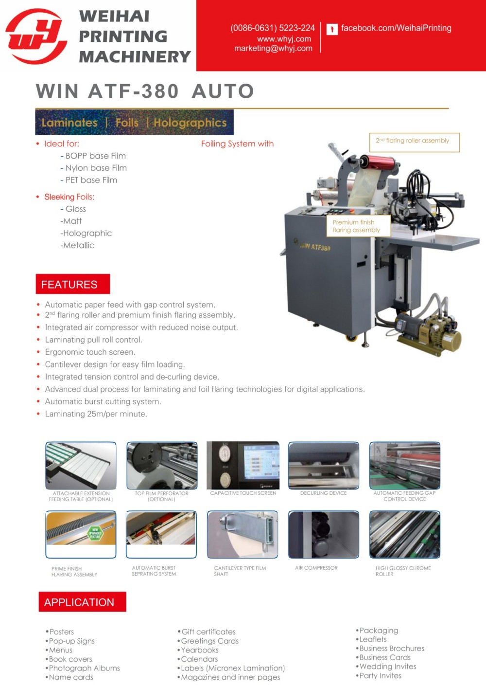 ওয়েইহাই প্রিন্টিং মেশিনারি কোং, লিমিটেড দ্বারা ডিজাইন এবং তৈরি করা হয়েছে, প্লেটমেকিং-ফ্রি লেমিনেটিং এবং ফয়েলিং মেশিন হল একটি ম্যানুয়াল পেপার-ফিডিং লেমিনেটিং এবং মেটাল ফয়েলিং মেশিন। এর কমপ্যাক্ট ডিজাইন ল্যামিনেটিং এবং মেটাল ফয়েলিং ফাংশন উভয়েই প্যাক করার সময় জায়গা বাঁচায়—আভ্যন্তরীণ আলংকারিক ছোঁয়া যোগ করতে চায় এমন ব্যবসার জন্য আদর্শ। এটি সাধারণ মুদ্রিত সামগ্রীগুলিকে সূক্ষ্ম সমাপ্ত পণ্যে পরিণত করে, ডিজিটাল অন-ডিমান্ড অ্যাপ্লিকেশন এবং ঐতিহ্যগত লিথোগ্রাফিক অফসেট প্রিন্ট উভয়ের সাথে নির্বিঘ্নে কাজ করে। সর্বোত্তম সম্ভাব্য ফলাফল পেতে, এটি একটি ইলেকট্রনিক কন্ট্রোল ডিভাইস দিয়ে সজ্জিত যা অপারেশন চলাকালীন রোলার চাপ এবং গরম করার তাপমাত্রা সামঞ্জস্য করে। এই সমন্বয়গুলি চলমান গতি, কাগজের বেধ এবং নকশার ধরণগুলির মতো বিষয়গুলির উপর ভিত্তি করে। এই মেশিনটি নিজেকে একটি শীর্ষস্থানীয় প্লেটমেকিং-মুক্ত হট স্ট্যাম্পিং এবং লেমিনেট করার সরঞ্জাম হিসাবে প্রমাণ করেছে, যা গ্রাহকদের তাদের পণ্যগুলিতে উল্লেখযোগ্য মূল্য যোগ করতে সহায়তা করে। গ্রাহকদের কাছে বেছে নেওয়ার জন্য বিস্তৃত স্তরিত ফিল্ম এবং ধাতব ফয়েল রয়েছে, যাতে তারা তাদের সমস্ত আলংকারিক চাহিদা পূরণ করতে পারে। এছাড়াও, এটিতে একটি বর্ধিত কাগজ খাওয়ানোর টেবিল রয়েছে, ব্যানার এবং অতিরিক্ত-দীর্ঘ মুদ্রিত উপকরণগুলির জন্য উপযুক্ত।